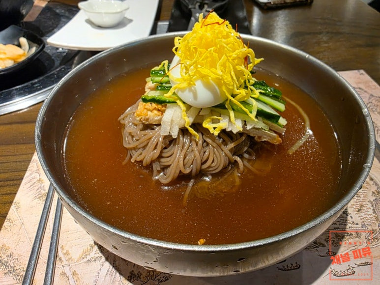 - 고명: 얇게 부쳐낸 소고기 육전이 냉면 위에 푸짐하게 올라가, 냉면의 시원함과 육전의 고소함을 함께 즐길 수 있습니다.