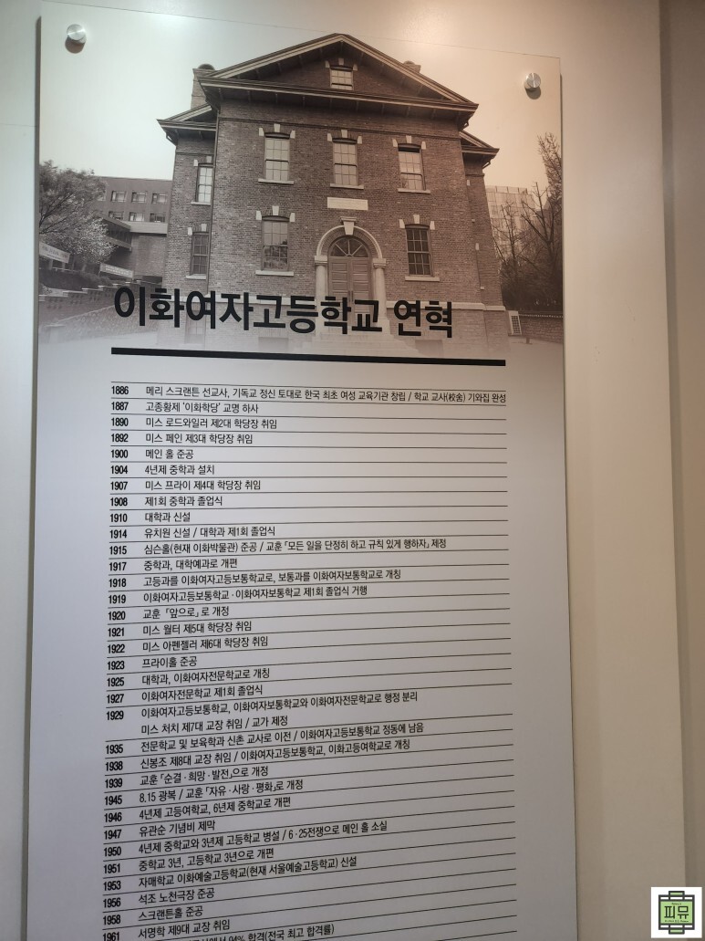 * 상설전시실: 이화의 역사와 관련된 다양한 교육자료를 전시하여 한국 여성 교육의 역사를 보여줍니다.
